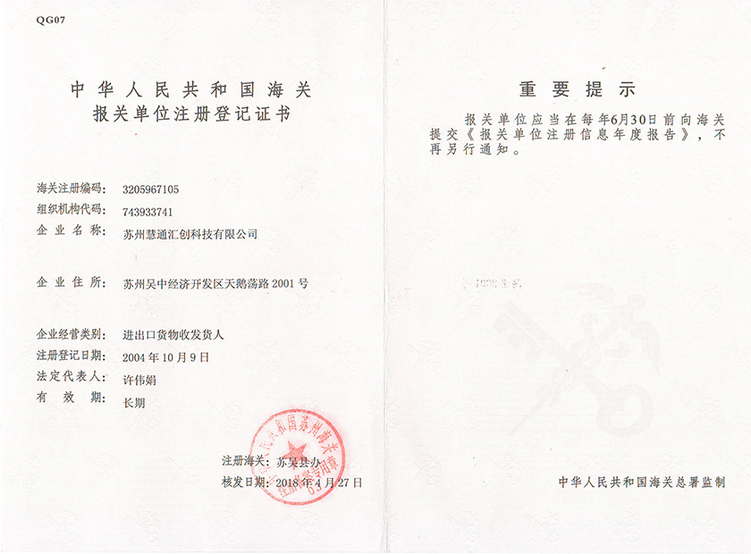 中華人民共和國(guó)海關(guān)報(bào)關(guān)單位注冊(cè)登記證書